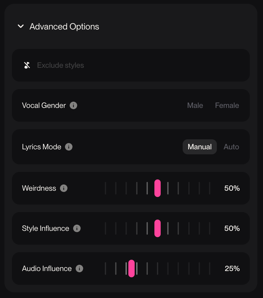 - Gendered vocals toggle. - Instrumental-only option. - Audio upload for reference blending. - Ideal for remixing and full tracks.